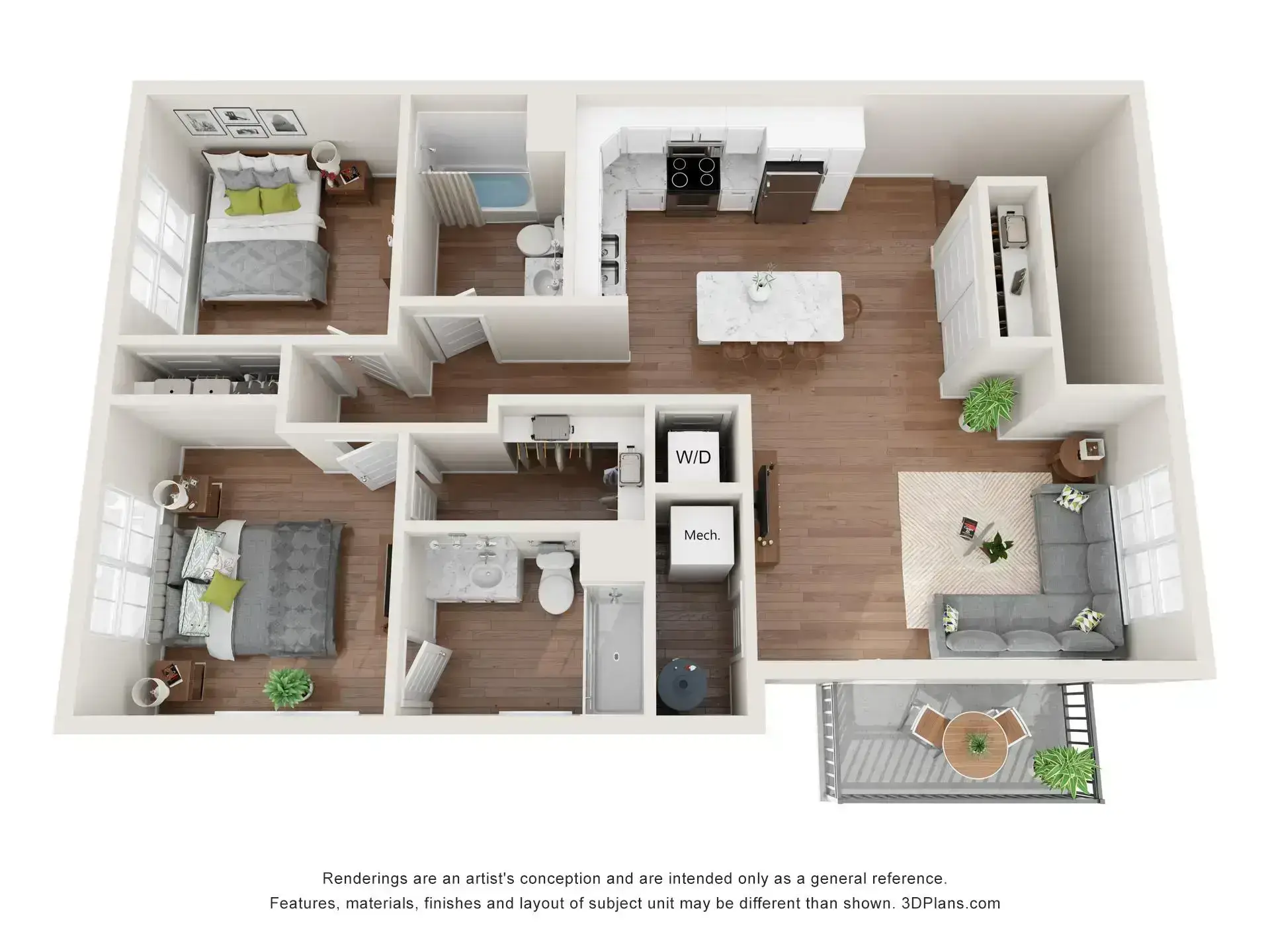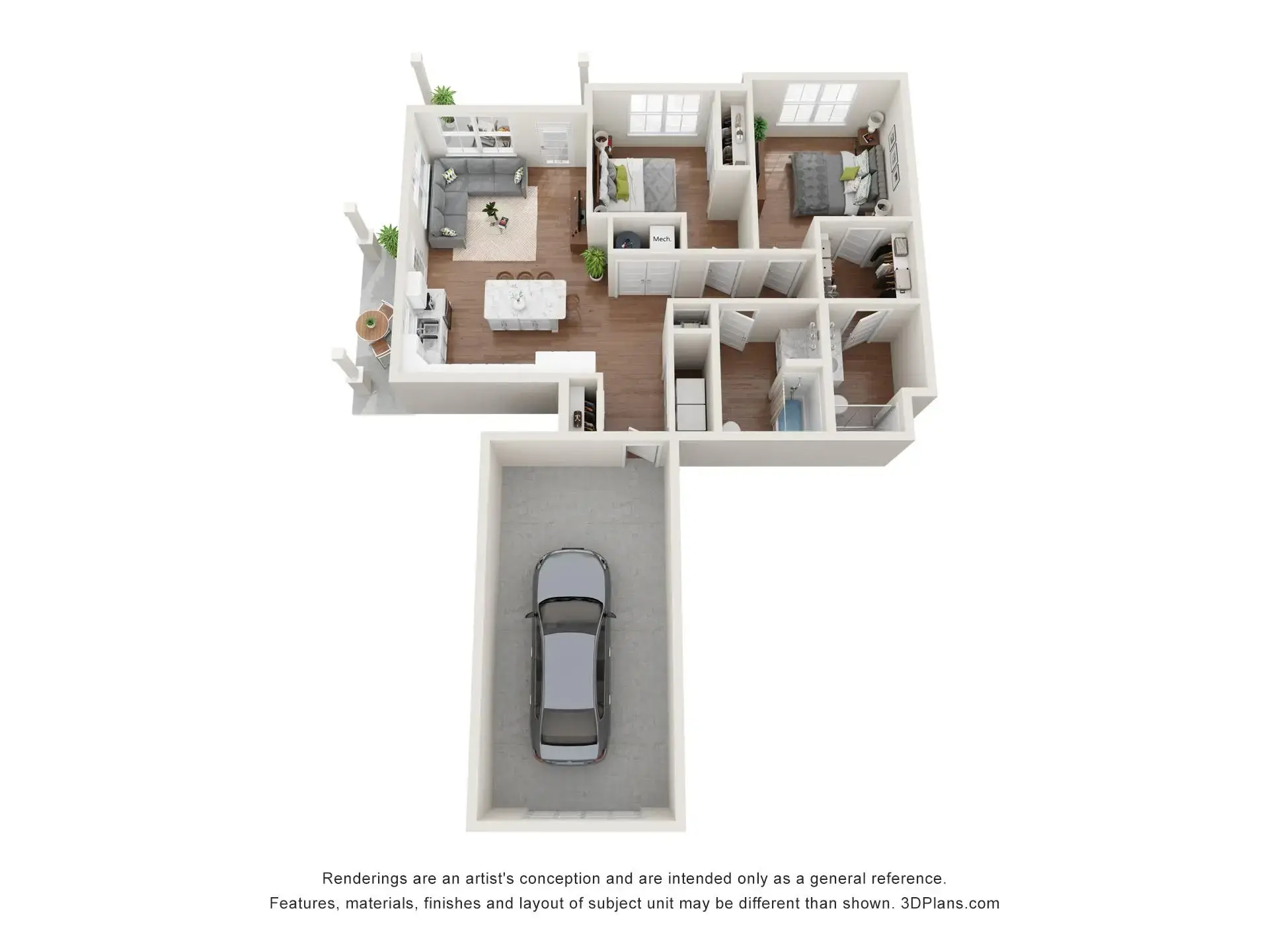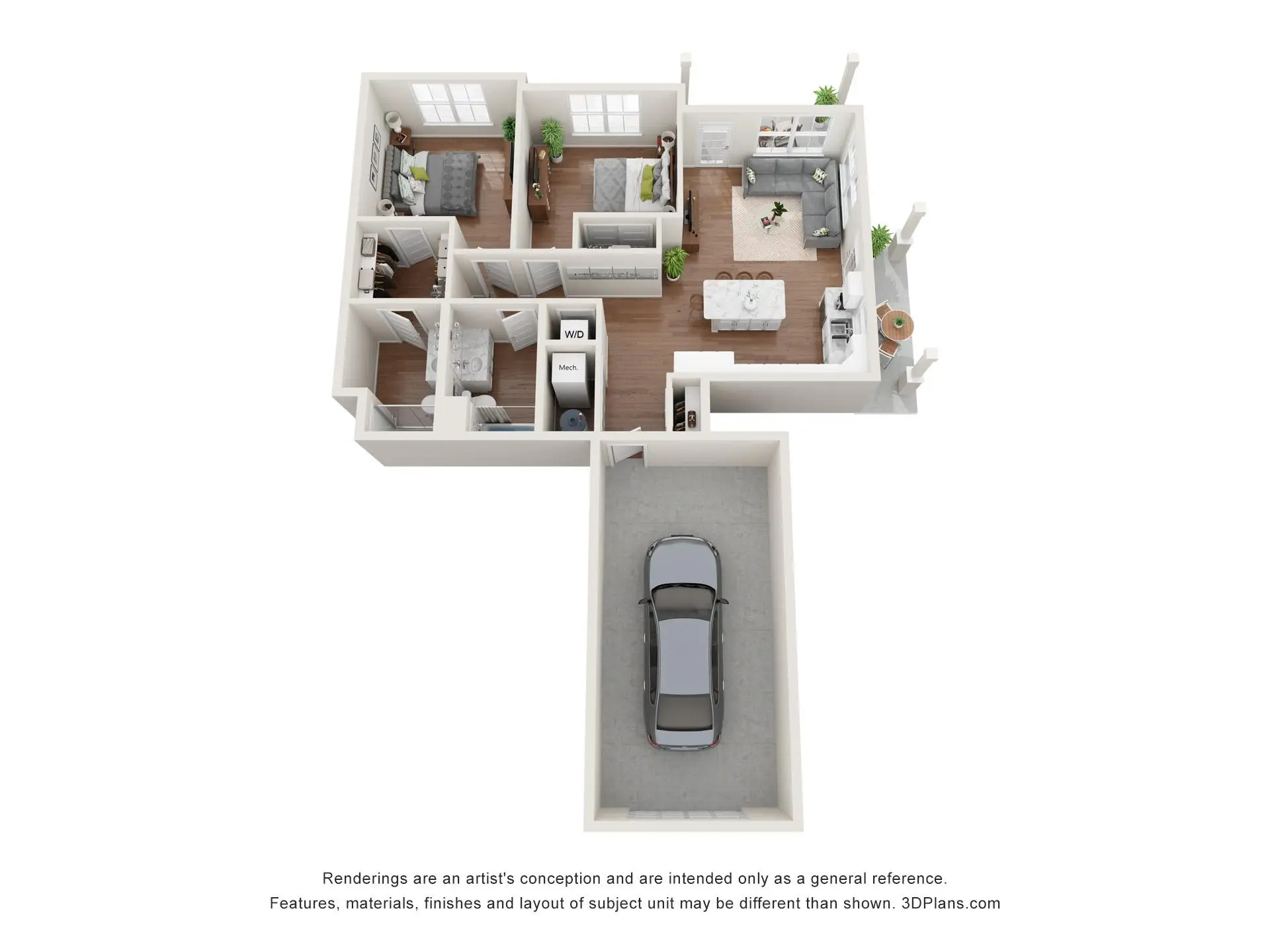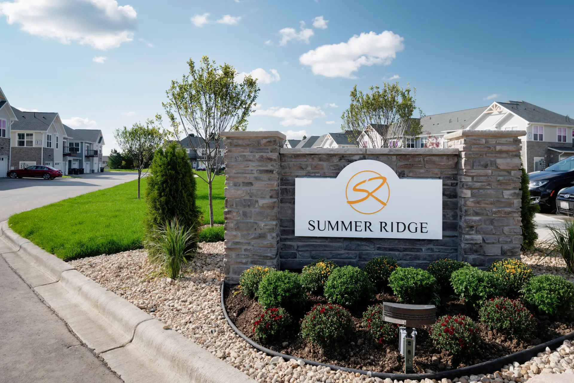 Summer Ridge offers luxury one-, two-, and three-bedroom townhouse-style apartments with private entrances, attached garages, and balconies or patios. Each unit features a primary bedroom with a walk-in closet, individually controlled heating and air conditioning, in-unit laundry, and top-of-the-line finishings.